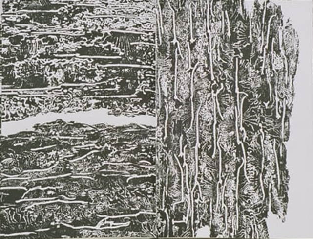 Eine Sonderausstellung mit dem Titel „Texture Prints” präsentierte ungewöhnliche, besondere Kunstwerke: Dahinter verbargen sich Grafiken und Künstlerbücher, die mit einer besonderen Abbildungstechnik, der ausstellende Künstler Peter Heckwolf nennt es „Text“, per Direktdruckverfahren gestaltet werden. Besonders beeindruckte mich ein Künstlerbuch, bei dem der Künstler in einer Serie den Borkenkäfer selbst schreiben ließ. Die direkten abgedruckten Fraßgänge von der Rinde ergaben dann „lesbare Texturen“ mit unglaublich vielen Möglichkeiten der Interpretation.